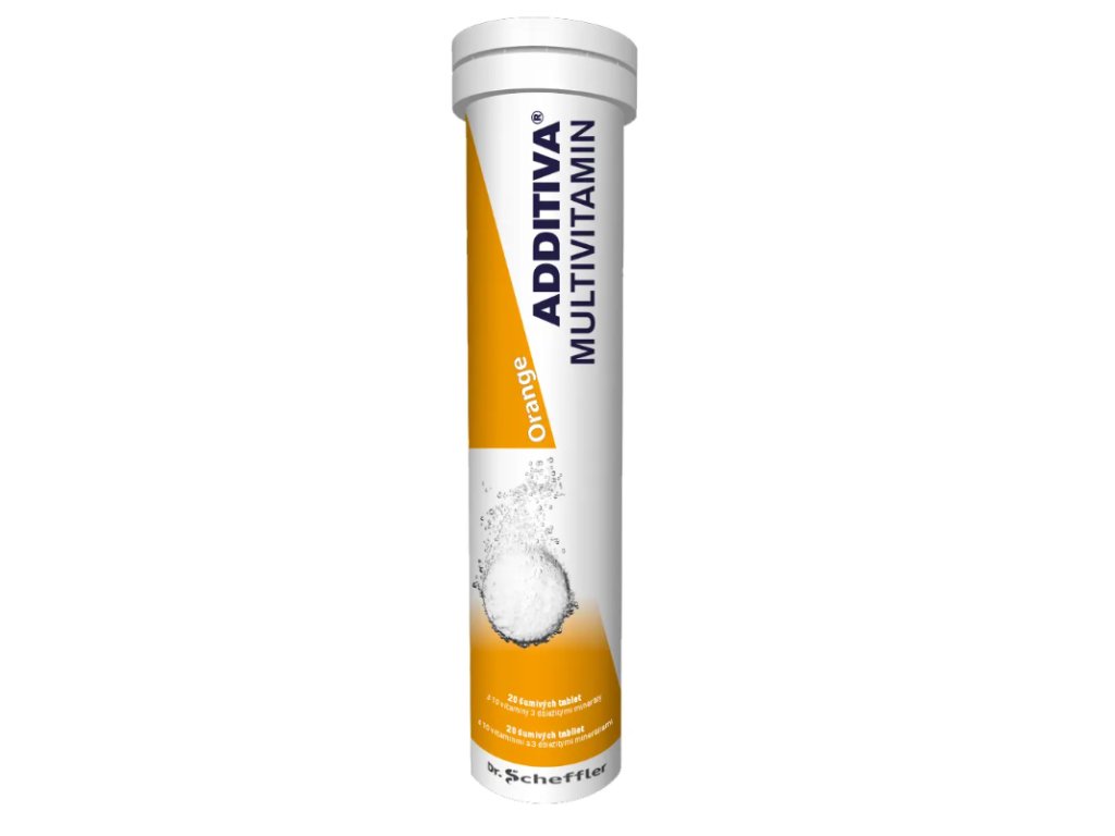 Additiva Multivitaminová směs obsahuje 10 vitaminů s příchutí pomeranče. Doplněk stravy ve formě šumivých tablet s příchutí pomeranče. Přispívá k normálmí činnosti imunitního systému, nervové soustavy, k udržení normálního stavu pokožky. Také přispívá ke snížení únavy a vyčerpání.