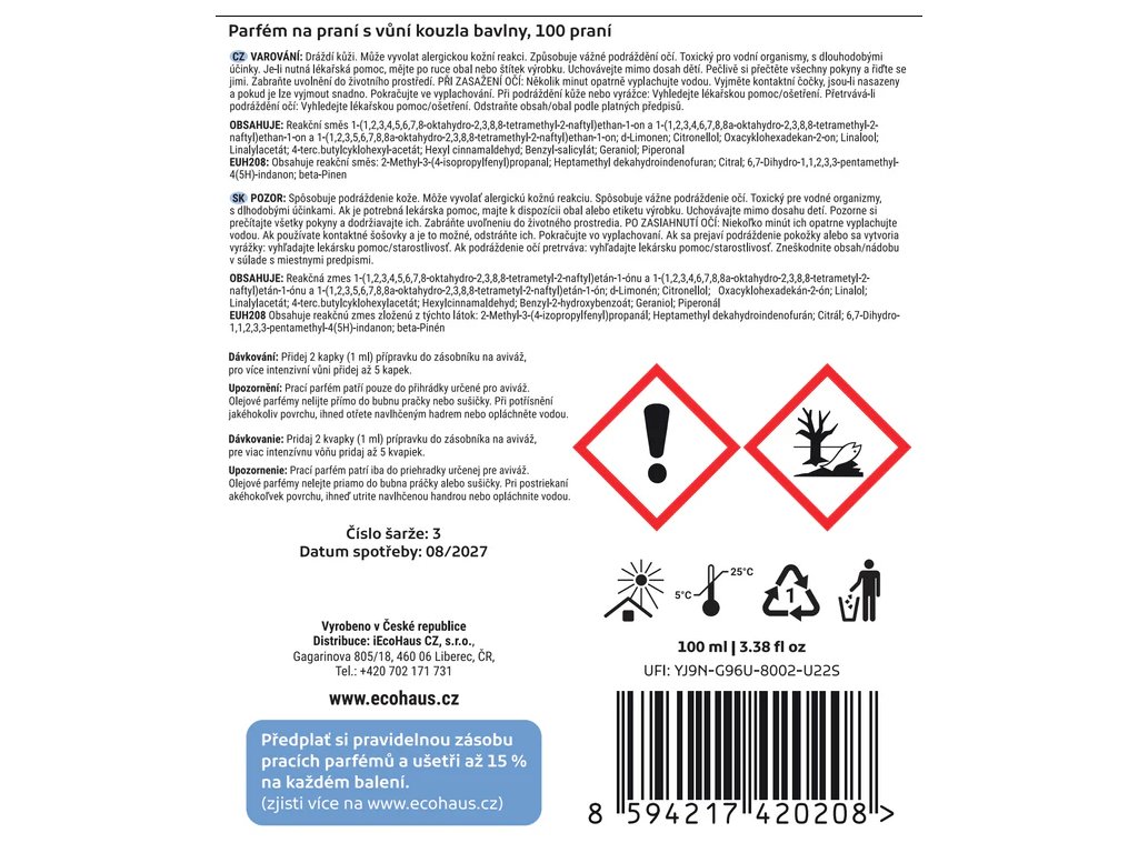 - Bohatý a hřejivý základ: Santalové dřevo, mošus a vanilka propůjčují této vůni hloubku a trvalost, díky čemuž bude tvoje prádlo dlouho vonět svěžestí.