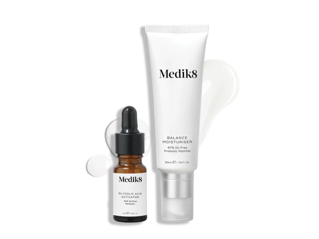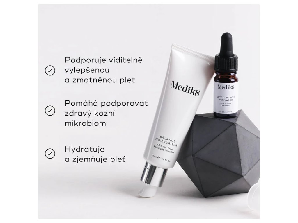 Odhalte viditelně hladkou, vyváženou a zdravě vypadající pleť s lehkým matujícím hydratačním krémem a aktivátorem s kyselinou glykolovou od Medik8.