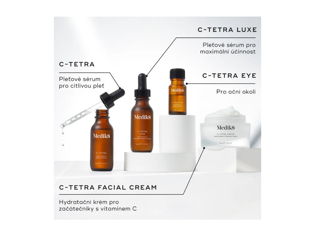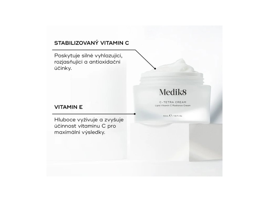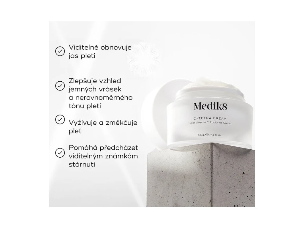 C-Tetra Cream pomáhá obnovit vzhled pleti a zářivost, zatímco chrání před viditelnými účinky stárnutí způsobenými environmentálními stresory. To vše díky prokázané antioxidační síle původního C-Tetra séra od Medik8, tentokrát v hedvábném a výživném krému.