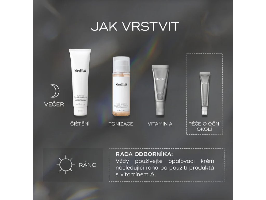 Výsledkem je hladší textura, sjednocený tón pleti a zpomalení projevů stárnutí. Díky chytrému složení jsou produkty Medik8 dobře tolerovány i při dlouhodobém používání.