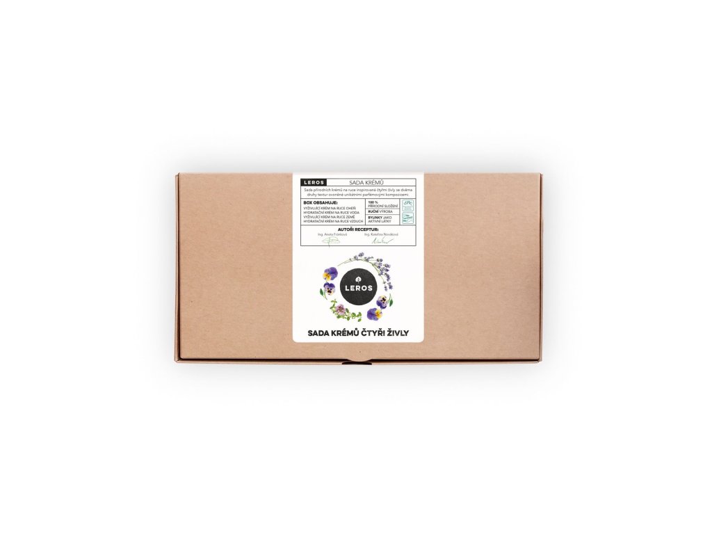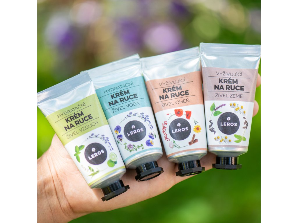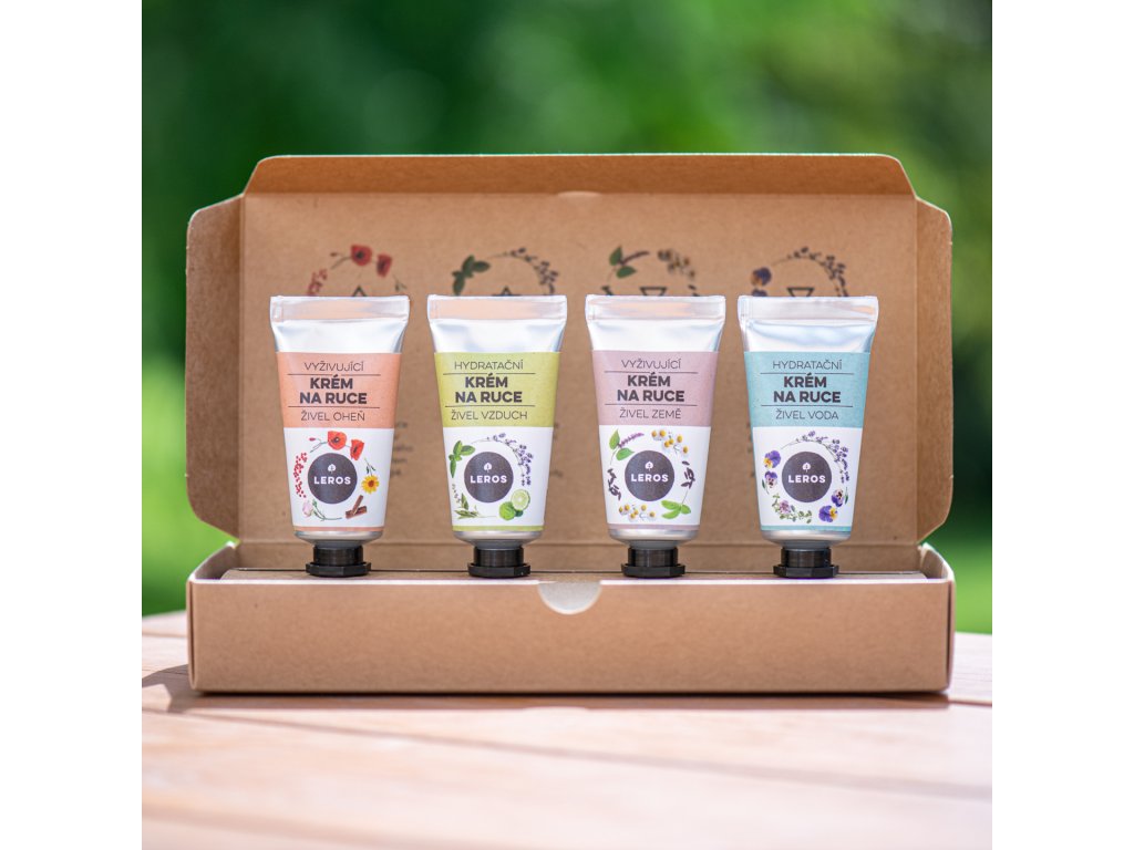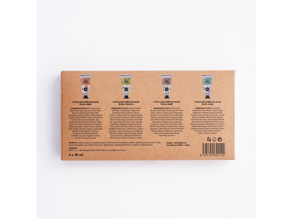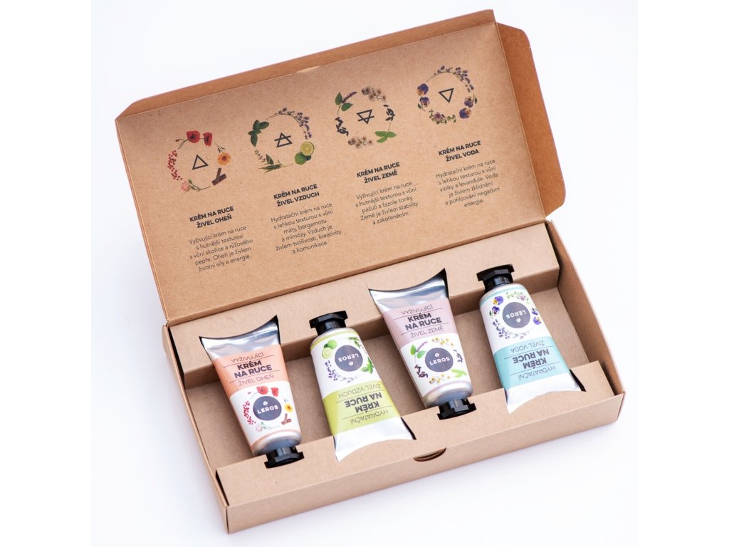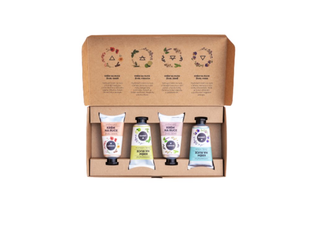 Sada krémů na ruce inspirována čtyřmi živly v dárkové krabičce. Každý krém je inspirovaný jedním ze živlů.