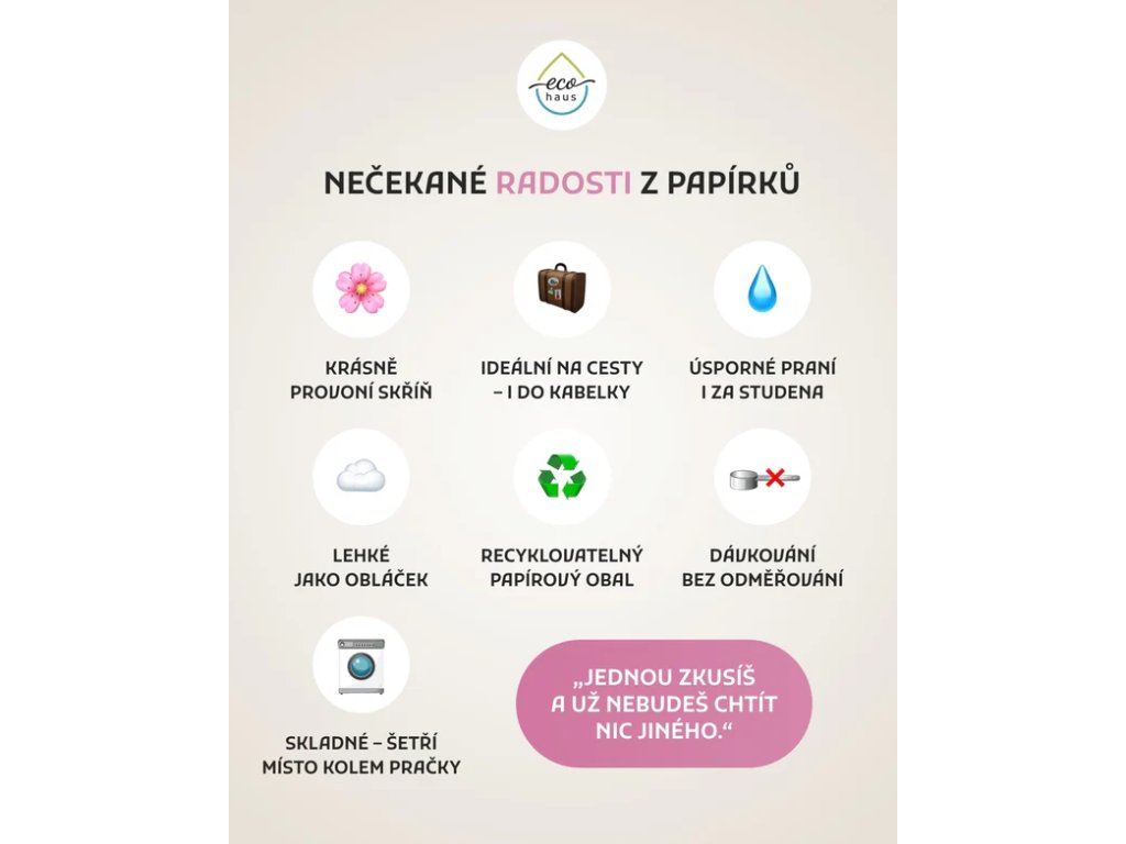 Prací papírky EcoHaus jsou 100 % biodegradabilní (biologicky rozložitelné).
