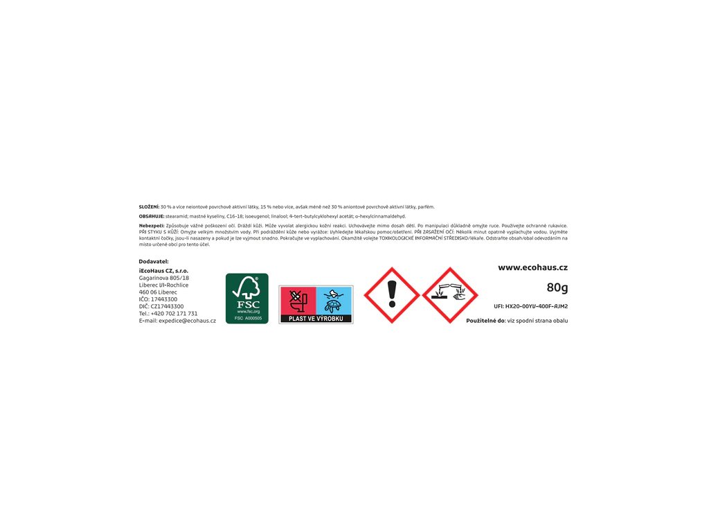 Složení: | Obsahuje: stearamid; mastné kyseliny, C16-18; isoeugenol; linalool; 4-tert-butylcyklohexyl acetát; α-hexylcinnamaldehyd Složky podle Nařízení (ES) č. 648/2004: 30 % a více neiontové povrchově aktivní látky, 15 % nebo více, avšak méně než 30 % aniontové povrchově aktivní látky, parfém. Na složení neustále pracujeme, aby zachoval účinnost a byl co nejméně chemicky zatížený. |