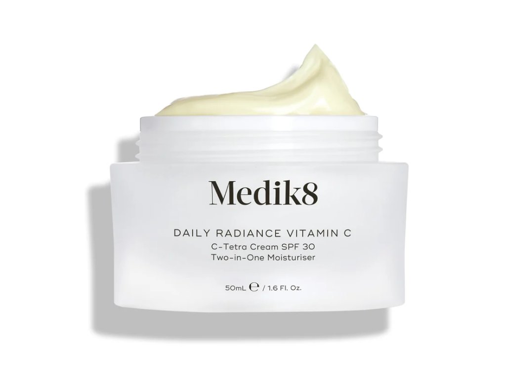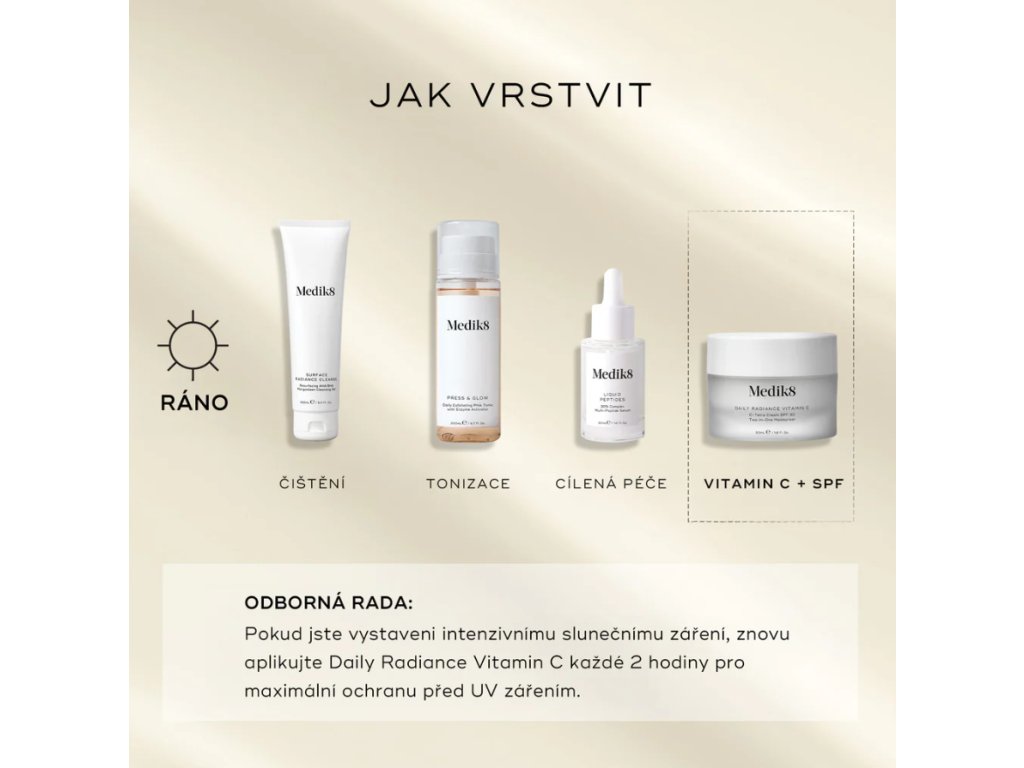 Dodejte své pleti každé ráno energii a nabijte ji ochranou s Daily Radiance Vitamin C, nejprodávanějším denním krémem s 7% vitamínem C a SPF 30 od Medik8. Jeho lehké složení poskytuje silnou antioxidační ochranu spolu s širokospektrální ochranou SPF 30, která chrání pleť před předčasnými známkami stárnutí. Díky jeho nemastné, jemné textuře, která se snadno vstřebává do pleti, 94% uživatelů souhlasí, že Daily Radiance Vitamin C se spíše cítí jako hydratační krém než opalovací krém.*