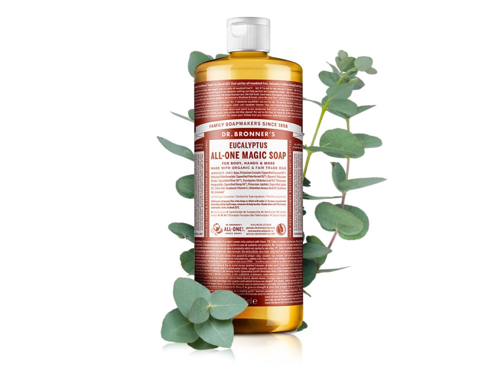 Tekuté univerzální mýdlo ALL-ONE Eukalyptus Dr. Bronner´s s eukalyptovým olejem je vyrobené z kombinace bio panenského kokosového, olivového, jojobového a konopného oleje, které tvoří jedinečné přírodní mýdlo. Přírodní olej z blahovičníku dodává mýdlu osvěžující vůni a podpoří antibakteriální působení. Vytvoří jemnou pěnu, která šetrně myje pokožku či vlasy, vyčistí zuby, umyje nádobí či vypere prádlo.