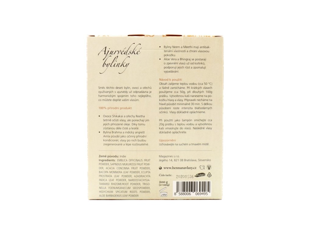 UPOZORNĚNÍ: Přírodní zábal a no poo šampon v jednom je vhodný i pro každodenní použití. Ajurvédské bylinky mohou barevně tónovat velmi světlé vlasy.